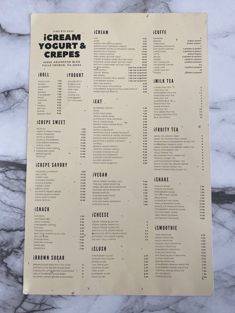 iCream Yogurt And Crepe is a classy spot in Falls Church, VA that offers a delightful combination of ice cream, frozen yogurt, crepes, and bubble tea. The menu includes vegan options and the place is wheelchair accessible, with outdoor seating available. Customers have raved about the creative dishes, such as the edible gold egg waffle and the delicious kinder bar egg waffle with ice cream. The atmosphere is described as relaxing, with smooth jazz playing in the background and friendly staff providing excellent service. Visitors can enjoy free Wi-Fi, a military discount, and even alcohol options. Overall, iCream Yogurt And Crepe seems to be a must-visit dessert spot for those with a sweet tooth, offering a unique and satisfying dining experience.